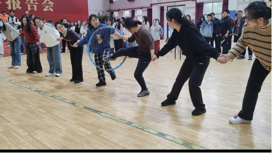 穿越呼啦圈时,年轻教师们主动放慢速度,配合年长教职工灵活钻圈,确保每一位成员都顺利通过。筷子夹球项目中,经验丰富的老教师手稳心细,稳稳夹住乒乓球传递给队友,年轻教师则快速衔接,确保无失误掉落;摸石头过河环节,老师们互相提醒落点,年轻教师帮扶着平衡稍弱的老教师,一步步扎实向前。