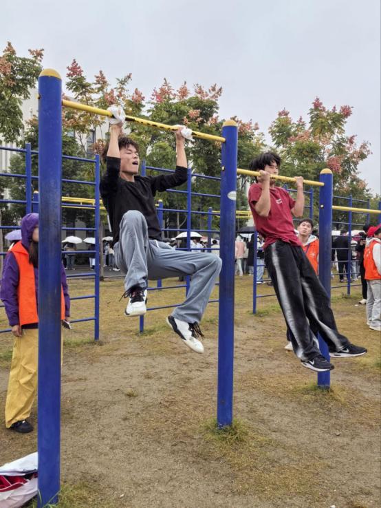 引体向上的横杆上,男生咬牙完成每一次上拉,汗水滴落却眼神坚定,展现医学生不服输的毅力。
