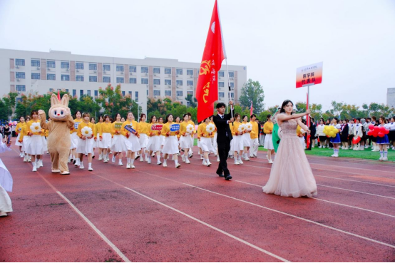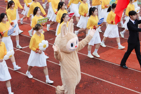 医学院代表方阵以其独特的设计和表演更是赢得了全场喝彩。66名学生代表身着黄衫白裙、白裤,有的手持“太阳花”,有的手持铭牌,他们脸上洋溢着自信与丛容的微笑,其中卡其色拉布布与青蛙人偶走在方阵两侧更是吸引了开幕式上每个人的目光,也为本次运动会注入了独特的“医学能量”,赢得现场师生的阵阵掌声。