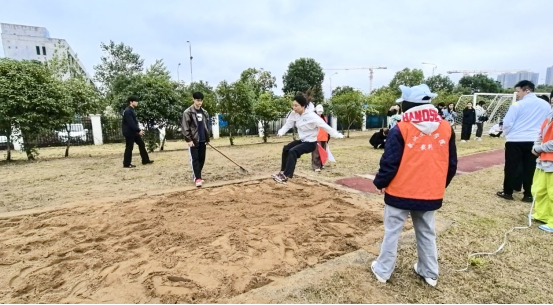 跳远沙坑前,男女子跳远参赛者助跑、奋力一跃,沙粒飞溅的瞬间,定格下青春的跃动轨迹。