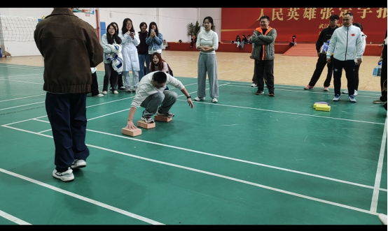 “快乐毛毛虫”项目里,龚琛、朱雪等教职工脚绑绑带,喊着“一二、一二”的整齐口号稳步向前,大家齐心协议一同冲过终点。