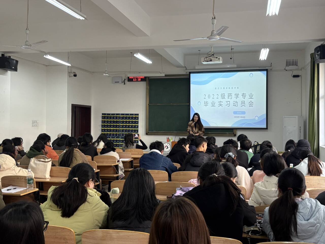 为扎实推进毕业环节教学工作,引导学生明确任务、端正态度,确保毕业论文与毕业实习高质量完成,医学院药学系于2025年11月26日组织召开了2026届毕业生毕业论文与毕业实习动员大会。会议由药学系胡娜老师主持,2026届全体药学专业毕业生参加。